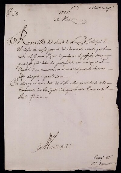 Rescritto del Senato di Nizza d'inibizione a chichesia, che venisse provvisto del Canonicato Vacato per la Morte del Canonico Alziari di prenderne il possesso senza prima far fede della sua provisione, che non abbia adempito a quanto sovra. 25. Marzo 1716.