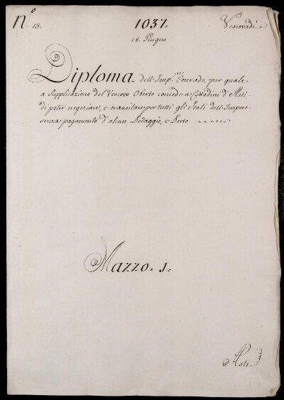 Diploma dell'Imperadore Conrado, per quale a supplicazione del Vescovo Oberto concede à Cittadini d'Asti di poter negoziare, e transitare per tutti gli Stati dell'Impero, senza pagamento d'alcun Pedaggio, e Porto 18. Giugno 1037
