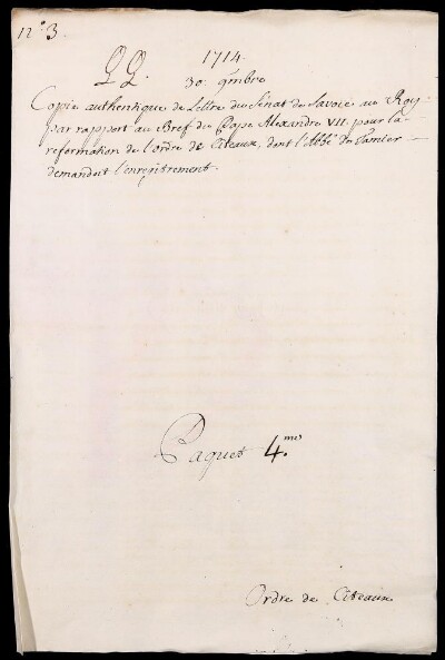 Sei in Strumenti di ricerca: Sezione Corte | Scritture riguardanti li regolari tanto di qua che di là da' monti in Materie ecclesiastiche [Inventario n. 87] | Regolari di là dai monti | Mazzo 4 | Fascicolo 3. Citeaux
