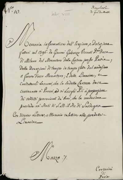 Sei in Strumenti di ricerca: Sezione Corte | Scritture riguardanti li regolari tanto di qua che di là da' monti in Materie ecclesiastiche [Inventario n. 87] | Regolari di quà dei monti | Mazzo 7 | Fascicolo 10. Certosa di Pavia