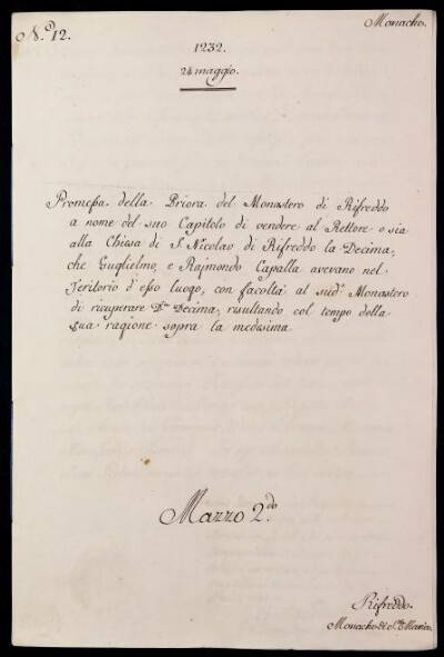 Sei in Strumenti di ricerca: Sezione Corte | Scritture riguardanti le monache tanto di qua che di là da' monti in Materie ecclesiastiche [Inventario n. 88] | Monache di qua da' monti | Mazzo 2 | Fascicolo 12. Rifreddo Monache di Santa Maria