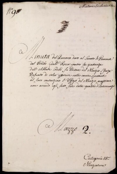 Minuta del ricorso dato al Senato di Piemonte dal Procurator Generale Rocca contro la giattanza dell'Abbate Codebò fu uditore del Nunzio Sforza defunto, di voler esercire nelle cause spettanti al foro contenzioso l'uffizio del Nunzio, massime non avendo egli fatto fede della qualità d'Internunzio