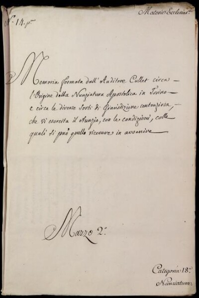 Memoria formata dall'Auditore Cullet circa l'origine della Nunziatura Apostolica in Torino, e circa le diverse sorti di giurisdizione contenziosa, che vi esercita il Nunzio, con le condizioni, colle quali si può quello ricevere in avvenire