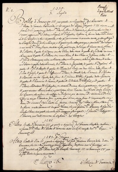 Bolla d'Innocenzo III per quale a supplicazione del Prevosto di S. Pietro di Ferrania Raimondo, e ad esempio del Papa Gregorio VIII riceve sotto la di lui protezione, e della Santa Sede la Chiesa di Ferrania, e stabilisce che in essa s'osservi perpetuamente l'ordine, e regola di S. Agostino; conferma a favore della medesima tutte le di lui possessioni, e beni che possiede, o che gli perveranno in avvenire tanto per concessione de' Pontefici, Donazioni de' Rè, e Prencipi, o di qualsivoglia altra persona, e specialmente del luogo, in cui resta situata detta Chiesa, con tutte le sue pertinenze, del luogo di Carretto con la Chiesa di S. Martino, di quello di Calizzano con tre Chiese, della metà di quello di Salicetto con una Chiesa, di metà di quello di Mallare con una Chiesa, di due Chiese a Grissiano, altra di S. Gio. di Montemagno, altra à Biestro, altra a Nocegrossa, altra a Cellanova, ed altra a S. Pietro in grado, della Piovania di S.ta Maria in Cornaletto (...)