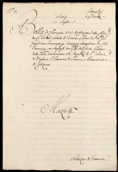Bolla di Clemente VIII di collazione della Chiesa de' SS. Pietro, e Paolo di Ferrania a favor del Rev.do Gio. Guglielmo Scarampo per rassegna fattagliene da Carlo Scarampo con consenso de' Signori del Cairo Patroni della medesima, unitamente alli Benefizi di S.ta Maria di Dogliani, S. Saturnino di Savona, e Parrocchiale di Calizano. 21. Luglio 1603