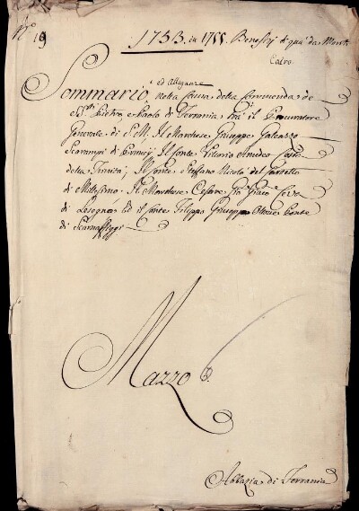 Sommario, ed alleganze nella causa della Commenda de' SS. Pietro, e Paolo di Ferrania trà il Pro.re g.n.ale di S.M., il Marchese Giuseppe Galeazzo Scarampi di Pruney, il Conte Vittorio Amedeo Costa della Trinità, il Conte Steffano Niccolò del Caretto di Millesimo, Il March.e Cesare Gio. Giacomo Ceva di Lezegno, ed il Conte Filippo Giuseppe Ottone Ponte di Scarnafiggi. 1753 in 1755