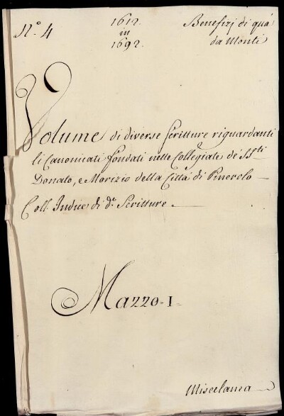 Volume di diverse Scritture riguardanti li Canonicati fondati nelle Insigni Collegiate de' S.ti Donato, e Morizio della Città di Pinerolo 1612. in 1692.