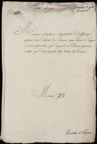 Memorie e Scritture riguardanti le differenze vertenti trà l'Abbate di S. Tomaso come Priore di Pagno, e diversi Particolari per l'aqua di cui detto Priore pretendea valersi per l'adaquamento delle Risere del Priorato. 1681 in 1705