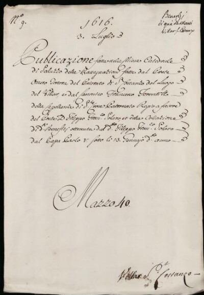 Sei in Strumenti di ricerca: Sezione Corte | Benefizi di qua dai monti in Materie ecclesiastiche [Inventario n. 81.2] | Benefizi di qua dai Monti | Mazzo 40 | Fascicolo 9. Villar S.Costanzo. Capellania di S.ta Croce e Priorato di S.t Costanzo