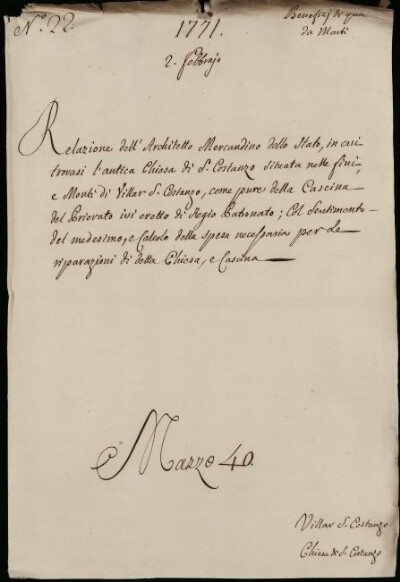 Sei in Strumenti di ricerca: Sezione Corte | Benefizi di qua dai monti in Materie ecclesiastiche [Inventario n. 81.2] | Benefizi di qua dai Monti | Mazzo 40 | Fascicolo 22. Villar S.Costanzo. Capellania di S.ta Croce e Priorato di S.t Costanzo