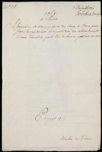 Sei in Strumenti di ricerca: Sezione Corte | Arcivescovadi e vescovadi stranieri in Materie ecclesiastiche [Inventario n. 80.2] | Senes, Vence, Vienne en Dauphine | Mazzo 1 | Fascicolo 15. Eveché de Vence