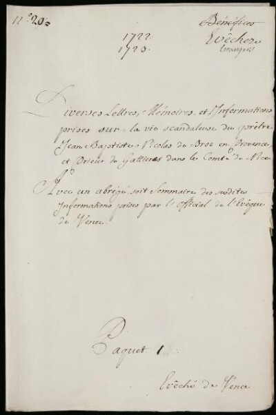 Sei in Strumenti di ricerca: Sezione Corte | Arcivescovadi e vescovadi stranieri in Materie ecclesiastiche [Inventario n. 80.2] | Senes, Vence, Vienne en Dauphine | Mazzo 1 | Fascicolo 20. Eveché de Vence