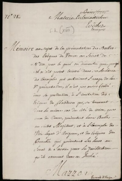 Memoire au sujet de la presentation des Bulles des Eveques de Vence au Senat de Nice, par Lequel on demontre, que quoiqu'il n'ait point trouvé dans ses Archives des Exemples, qui authorisent l'usage de la dite presentation, il n'est pas moins fondé dans sa pretention, à limitation des Eveques de Glandeves, qui, se trouvant dans le même Cas du coté de Nice, que Ceux de Vence, presentent leurs Bulles au susdit Magistrat, et à l'Exemple des Vice Legats d'Avignon, et des Eveques de Grenoble qui presentent les leurs au Senat de Savoïe pour La Jurisdiction, qu'ils exercent dans ce Duché