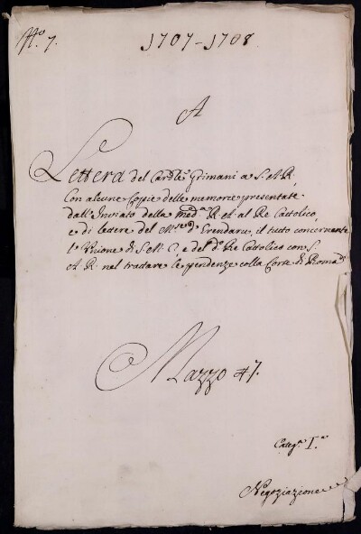 Lettera del Cardinale Grimani a S. A. R. con alcune copie delle Memorie presentate dall'Inviato della Medesima A. R. al Ré Cattolico, e di Lettere del Marchese D'Erendaru il tutto concernente L'Unione di S. M. Ces.a, e del Re Cattolico con S. A. R. nel trattare le pendenze colla Corte di Roma. 1707. in 1708
