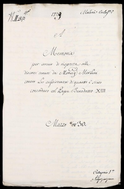 Sei in Strumenti di ricerca: Sezione Corte | Materie ecclesiastiche per categorie [Inventario n. 79.1] | Categoria 1. Negoziazione colla Corte di Roma | Mazzo 30 | Fascicolo 11