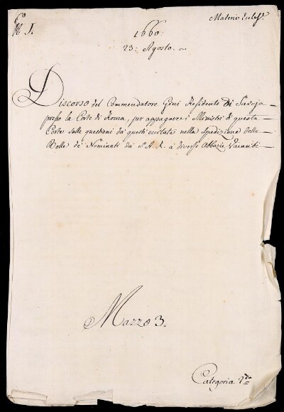 Discorso del Comendatore Gini Residente di Savoja presso la Corte di Roma per appagare i Ministri di questa Corte sulle questioni da questi eccitate nella spedizione delle Bolle de' Nominati da S. A. R. a diverse Abbazie Vacanti. 23. Agosto 1660