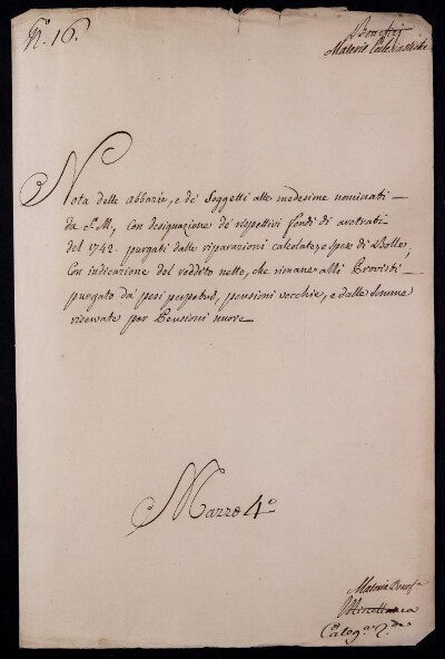 Nota delle Abbazie, e de' Soggetti alle med.e nominati da S. M., con designaz.e de' rispettivi Fondi d'Aretrati del 1742. purgati dalle riparazioni calcolate, e spese di Bolle; con Indicaz.e del reddito netto, che rimane alli provisti purgato da pesi perpetui, pensioni vecchie, e dalle somme riservate per pensioni nuove