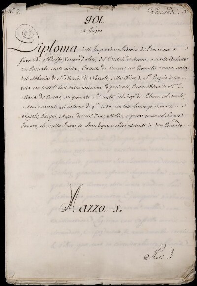 Diploma dell'Imperadore Ludovico di Donaz.e a favore di Ardulfo Vescovo d'Asti, del Contado di Benne, o sia Bredulenze, con giornate 100 milla, Castello di Benne, con Gior.te m/30, dell'Abbazia di S.ta Maria di Narzole, della Chiesa di S. Gregorio della Villa, con tutti li Beni dalla medesima dipendenti, della Chiesa di S.a Maria di Cervere, con g.te 600. Del Luogo di Salmor, col Monte, e Beni esistenti all'intorno di g.te 1070, con tutte Le sue pertinenze, Regali Pasqui, Acque, discorsi d'esse, Molini, e Pesca, tanto nel Fiume Tanaro, che nella Stura, ed altre Acque, e Rivi esist.ti in d.o Contado. 18. Giugno 901