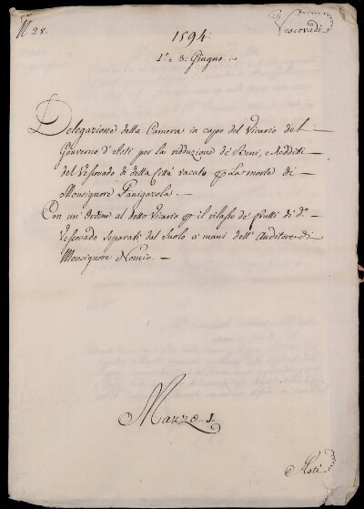 Sei in Strumenti di ricerca: Sezione Corte | Arcivescovadi e vescovadi in Materie ecclesiastiche [Inventario n. 80] | Vescovado di Asti | Mazzo 1 | Fascicolo 28