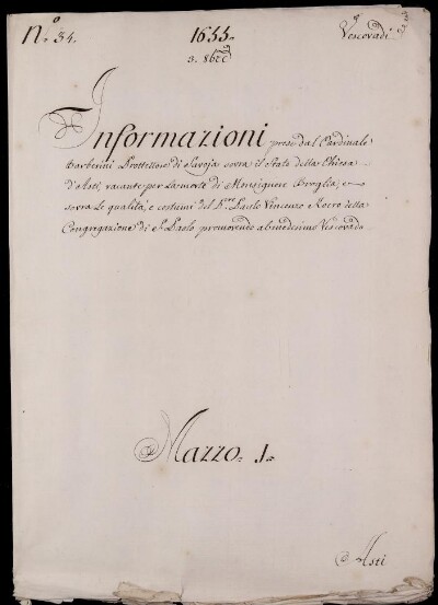 Sei in Strumenti di ricerca: Sezione Corte | Arcivescovadi e vescovadi in Materie ecclesiastiche [Inventario n. 80] | Vescovado di Asti | Mazzo 1 | Fascicolo 34