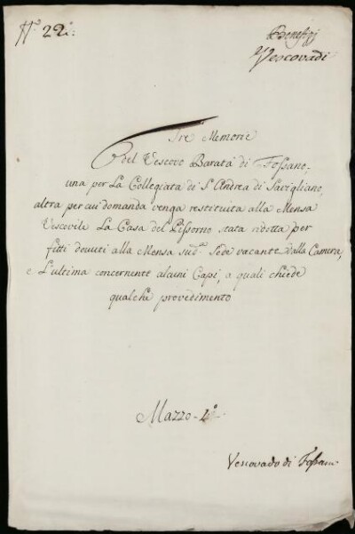 Sei in Strumenti di ricerca: Sezione Corte | Arcivescovadi e vescovadi in Materie ecclesiastiche [Inventario n. 80] | Vescovado di Fossano | Mazzo 1 | Fascicolo 22