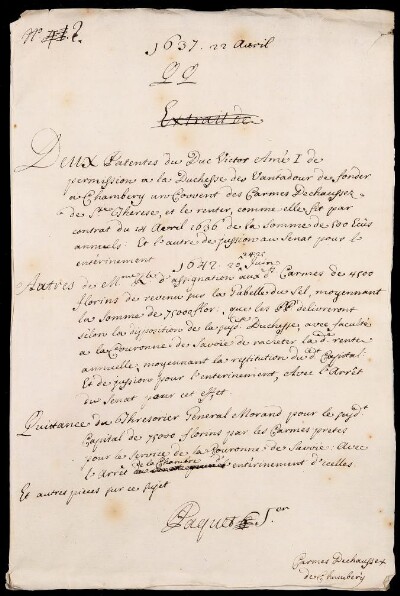 Deux Patentes du Duc Victor Amé I. de permission a la Duchesse de Vantadour de fonder a Chambery un Convent des Carmes Dechaussez de S.te Therese, et le renter, comme Elle fit par contrat de 14. avril 1636. de la somme de 500. ecus annuels. et l'autre de jussion au Senat pour l'Enterinement 22. Avril 1637