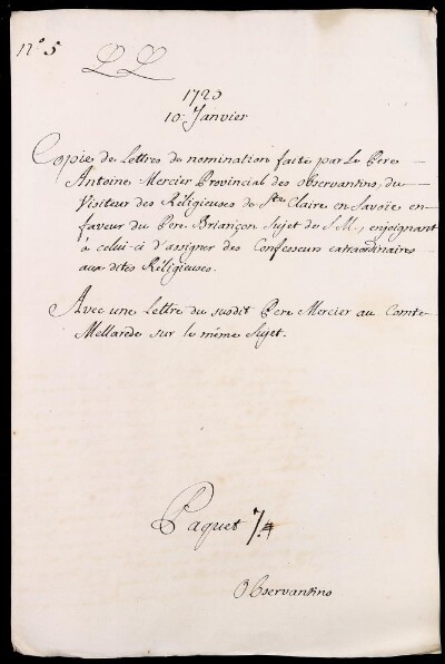 Sei in Strumenti di ricerca: Sezione Corte | Scritture riguardanti li regolari tanto di qua che di là da' monti in Materie ecclesiastiche [Inventario n. 87] | Regolari di là dai monti | Mazzo 7 | Fascicolo 5. Mineurs Observantins de S. François de Savoie en General