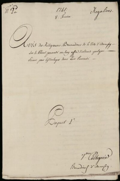 Avis des Religieuses Bernardines de la Ville d'Annecy sur le Placet presentè au Roy affin d'obtenir quelque secours pour Les soulager dans leur Pauvreté. 8. Fevriere 1741