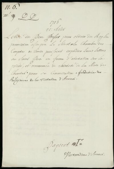 Lettre du Pere Presset pour obtenir du Roy la permission afin que le Senat, et la Chambre des Comptes de Turin puissent expedier Leurs lettres au Saint Pere en forme d'attestation sur la Piété, et renomée de saintété de la Mere de Chantal pour sa Canonisation fondatrice des Religieuses de la Visitation d'Annecy. 22. Aôut 1716