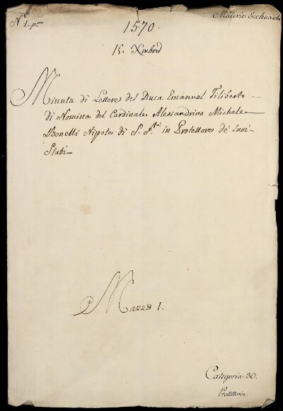 Sei in Strumenti di ricerca: Sezione Corte | Materie ecclesiastiche per categorie [Inventario n. 79.2] | Categoria 30. Protettoria | Mazzo 1 | Fascicolo 1.1