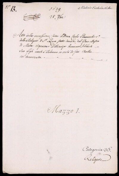 Sei in Strumenti di ricerca: Sezione Corte | Materie ecclesiastiche per categorie [Inventario n. 79.2] | Categoria 36. Reliquie | Mazzo 1 | Fascicolo 13