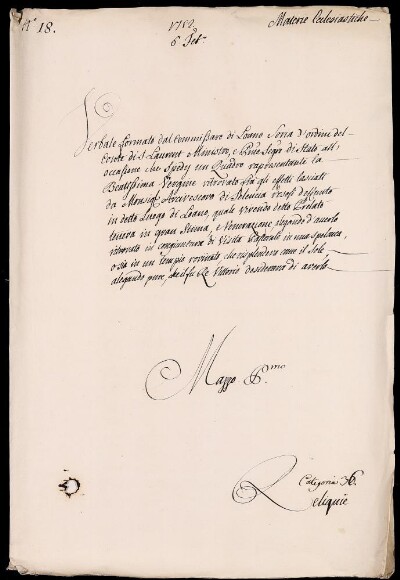 Verbale formato dal Commessario di Loano Soria d'ordine del Conte di S. Laurent Ministro, e P.mo Segretario di Stato all'occasione, che spedì un quadro rappresentante la Beatissima Vergine ritrovato fra gl'effetti lasciati da Monsignor Arcivescovo di Seleucia resosi defunto in d.o luogo di Loano, quale vivendo detto Prelato teneva in grande stima, e venerazione, allegando d'averlo ritrovato in congiuntura di visita pastorale in una spelonca, o sia in un tempio rovinato, che risplendeva come il sole, allegando pure, che il fu Re Vittorio desiderava di averlo. 6. febbrajo 1752