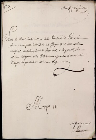 Sei in Strumenti di ricerca: Sezione Corte | Benefizi di qua dai monti in Materie ecclesiastiche [Inventario n. 81.3] | Benefizi di qua dà Monti | Mazzo 11. Miscellanea | Fascicolo 8