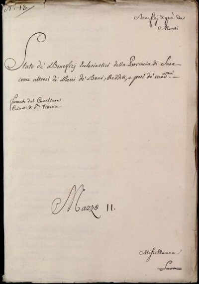 Sei in Strumenti di ricerca: Sezione Corte | Benefizi di qua dai monti in Materie ecclesiastiche [Inventario n. 81.3] | Benefizi di qua dà Monti | Mazzo 11. Miscellanea | Fascicolo 13