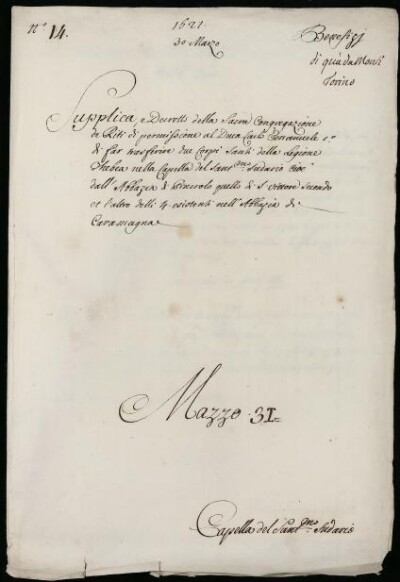 Supplica, e decreto della Sacra Congregazione de' Riti di permissione al Duca Carlo Emanuel I.° di far trasferire due Corpi Santi della Legione Tebea nella Capella del SS.mo Sudario, cioè dall'Abbazia di Pinerolo quello di S. Vittore secondo, e l'altro delli 4. esistenti nell'Abbazia di Caramagna 30. marzo 1621