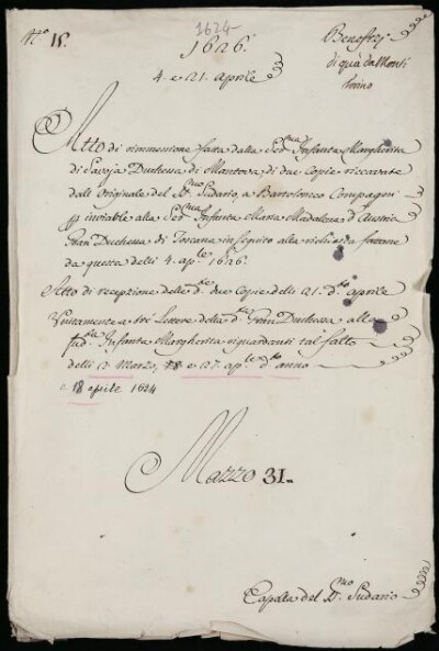 Atto di recepzione delle dette due Copie delli 21. ap.le detto anno Unitamente a tre lettere della d.ta Gran Duchessa alla sud.ta Infanta Margherita riguardanti tal fatto