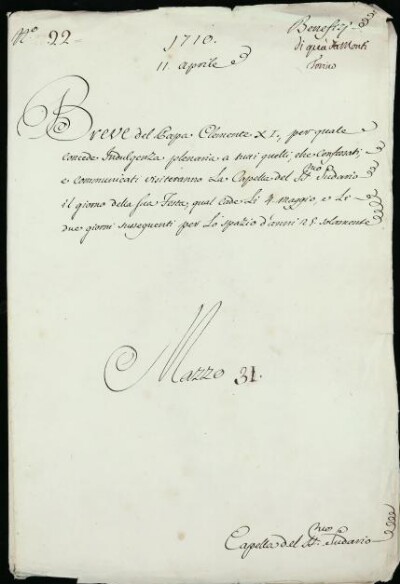 Breve del Papa Clemente XI, per qual concede indulgenza plenaria a tutti quelli che confessati, e communicati visiteranno la Capella del SS.mo Sudario il giorno della sua festa, e li due giorni susseguenti per lo spazio d'anni 25. solamente. 11. aprile 1710