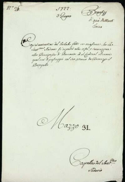 Sei in Strumenti di ricerca: Sezione Corte | Benefizi di qua dai monti in Materie ecclesiastiche [Inventario n. 81.2] | Benefizi di qua dai Monti | Mazzo 31. Torino. Capella del SS.mo Sudario | Fascicolo 26
