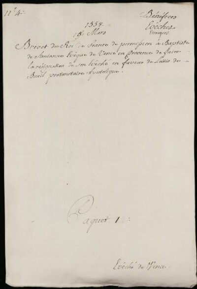 Sei in Strumenti di ricerca: Sezione Corte | Arcivescovadi e vescovadi stranieri in Materie ecclesiastiche [Inventario n. 80.2] | Senes, Vence, Vienne en Dauphine | Mazzo 1 | Fascicolo 4. Eveché de Vence