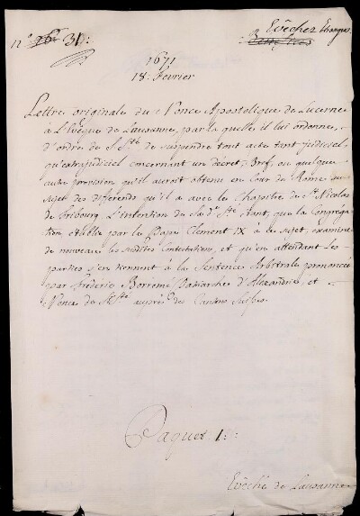 Lettre originale du Nonce Appostolique de Lucerne à l'Eveque de Lausanne, par la quelle il lui ordonne d'ordre de S. S.té de suspendre tout acte tant judiciel, qu'extrajudiciel concernant un decret, Bref, ou quelqu'autre provision, qu'il auroit obtenu en Cour de Rome au sujet des differends, qu'il a avec le Chapitre de S.t Nicolas de Fribourg, l'intention de S. S.té étant, que la Congregation établie par le Pape Clement IX. à cet sujet, examine de nouveau les susdites contestations, et qu'en attendant les parties s'en tiennent à la Sentence arbitrale prononcée par Frederic Borromé Patriarche d'Alexandrie, et Nonce de S. S.té auprès des Cantons Suisses. 18. Fevrier. 1671