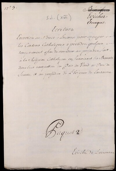 Ecriture envoiée au Nonce à Lucerne pour engager les Cantons Catholiques à prendre quelque temperament, afin de remedier au prejudice fait à la Religion Catholique en favorisant les Bernois dans leur usurpation du Païs de Vaud au Duc de Savoïe, et au prjudice de l'Eveque de Lausanne
