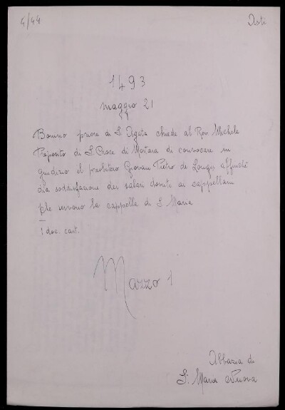 Sei in Strumenti di ricerca: Sezione Corte | Abbazie Asti, Santa Maria Nuova in Materie ecclesiastiche [Inventario n. 315.1] | Santa Maria Nuova | Istromenti privati, patti con massari,atti di visite apostoliche, inventari dei beni della chiesa (...) | Fascicolo 4.44