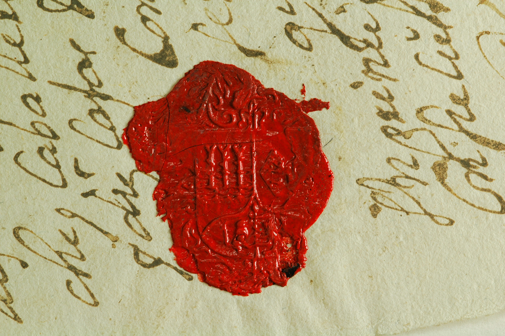 Scudo arrotondato, partito e innestato in punta; al 1° a tre tronchi noderosi posti uno vicino all'altro e nodriti nella campagna mareggiata, al 2° ad un fuso carico di un leone (?); al 3° a due leoni affrontati e controrampanti ad un'alabarda (?). Lo scudo è accollato a una croce gigliata e timbrato da un elmo ornato di lambrecchini