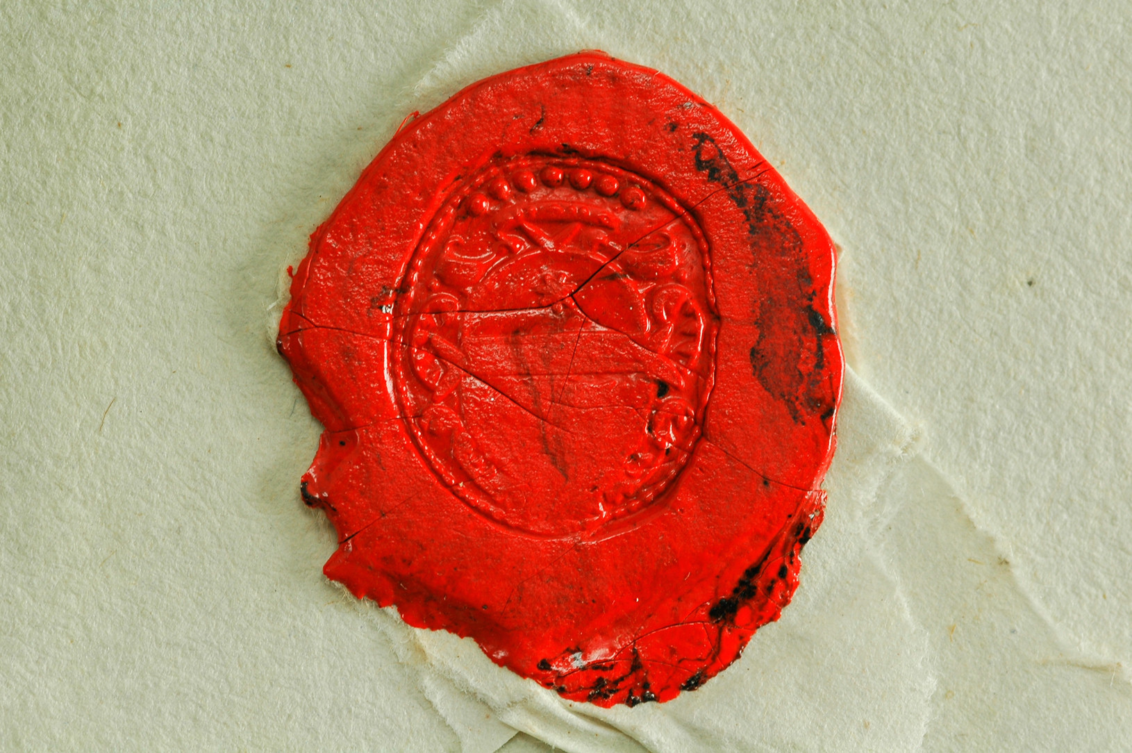 Scudo ovale a cartocci malamente leggibile; si intravede un capo carico di una stella a sette raggi, sostenuto da una fascia. Lo scudo è timbrato da una corona a sette palle e accollato dalla croce di Malta