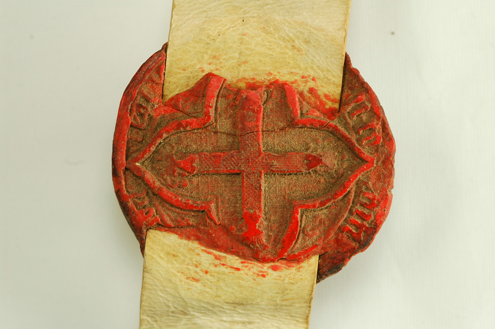 Croce ingollata da quattro teste di leopardo, in cornice quadrilobata che interrompe la legenda. Nelle interlobature, quattro nodi di Savoia