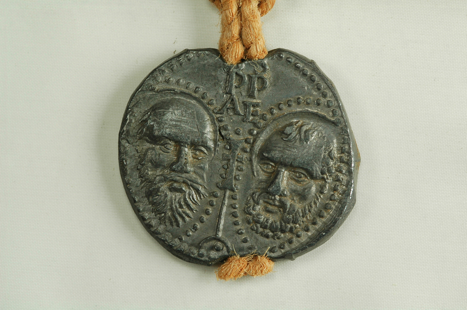 Teste dei santi Paolo e Pietro divise dalla croce astile sormontata dalle lettere S(anctus) PA(ulus) S(anctus) PE(trus) disposte verticalmente
