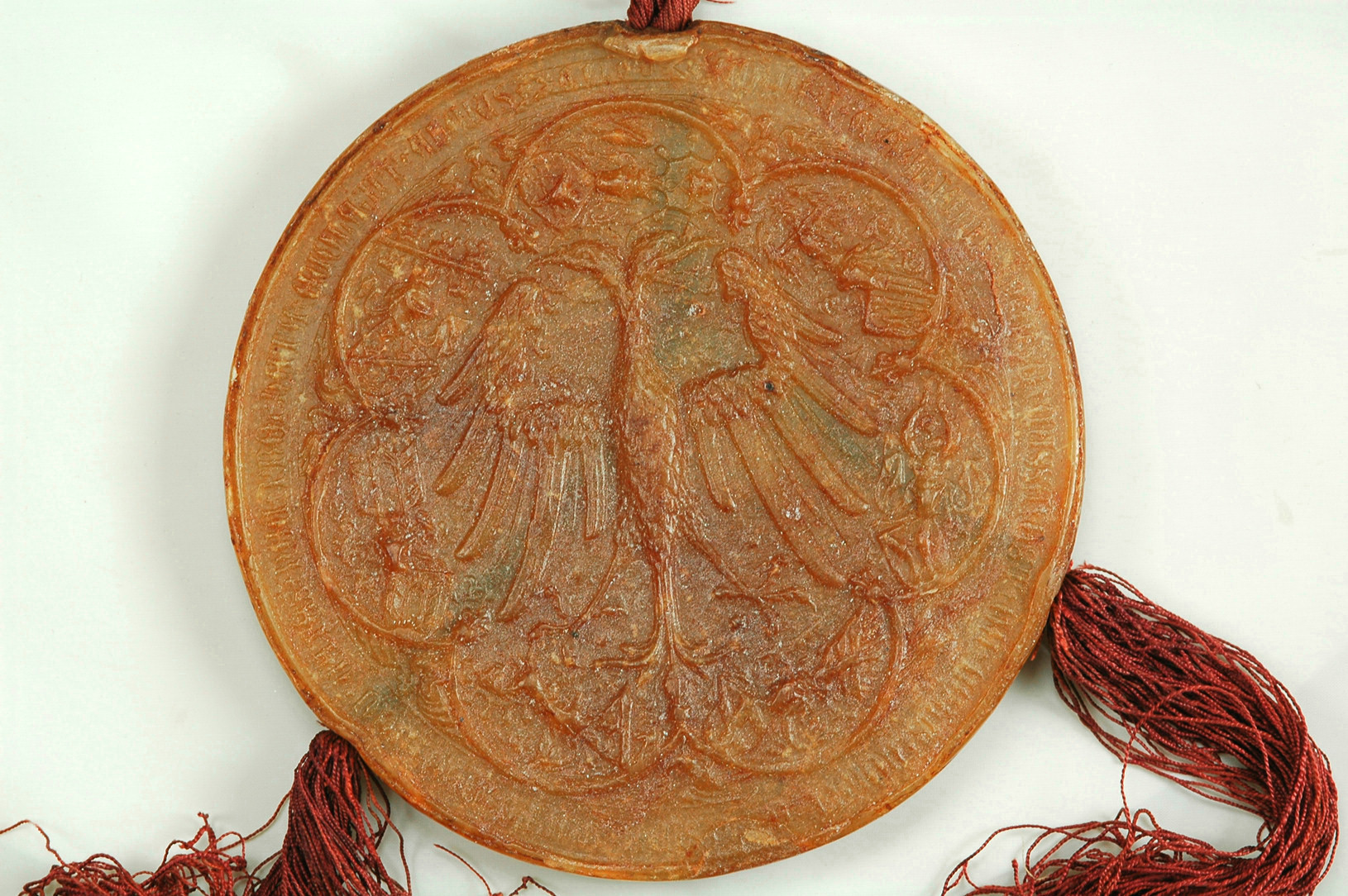 SIGILLUM * MAIESTAL(is) * FRIDERICI * DEI * GRA(ti)A * ROMANORUM / IMPERATORIS * SEMPER * AUGUSTI * DUCIS * AUSTRIE * STIRIE // KARINTHIE * ET * CARNIOLE * / * COMITIS * Q(ue) * TYROLIS * ET C(etera) * *