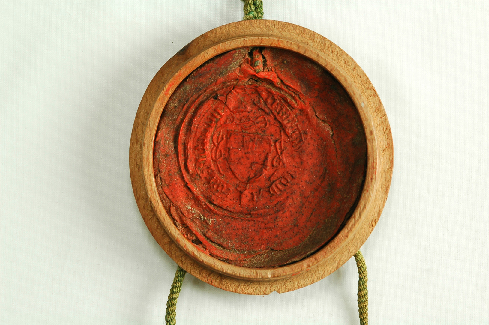 Scudo alla croce circondato da tre nodi di Savoia. La legenda corre su nastro ripiegato e arrotolato alle estremità