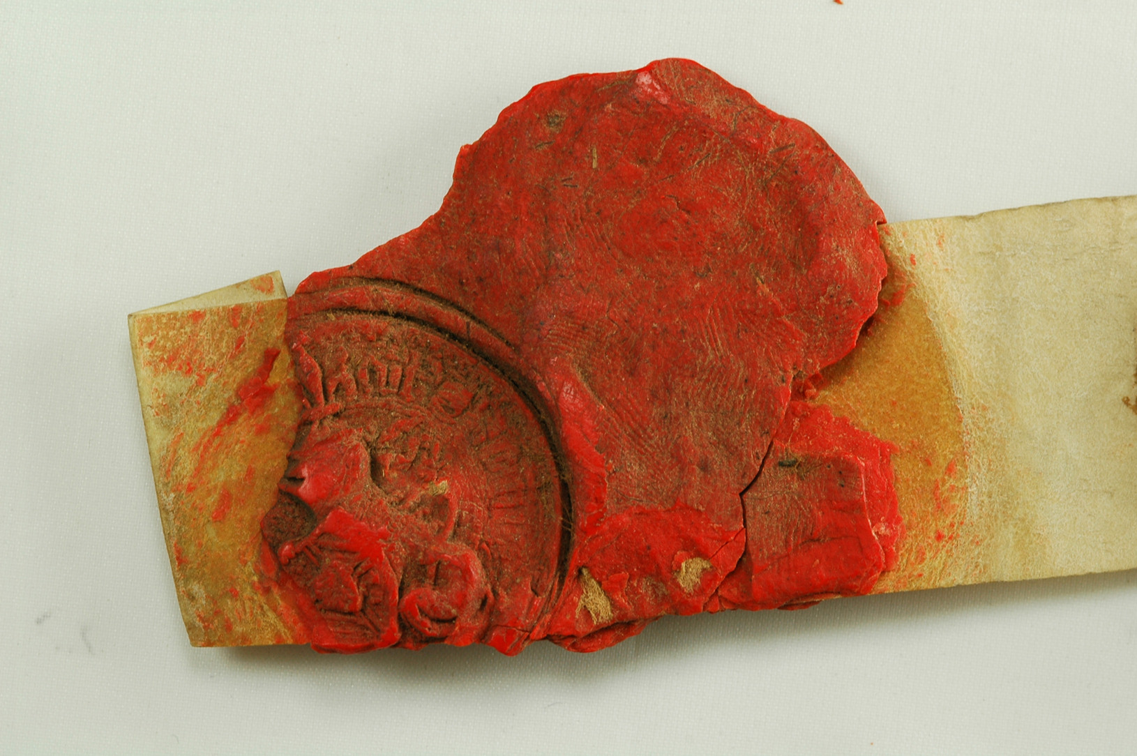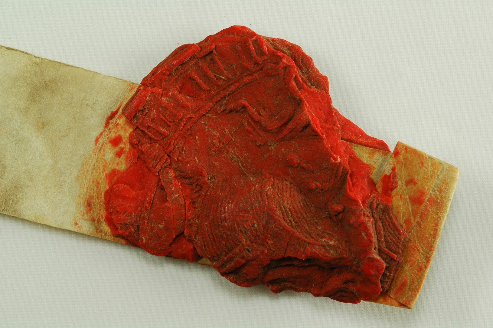 Impronta frammentaria. Si conserva parte di un cavaliere al galoppo verso destra, con una veste svolazzante ornata di nappe; il cavallo è coperto da una cotta di maglia cui sono applicati [panni inquartati al 1° e al 4° di Borgogna moderna, al 2° e al 3° di Borgogna antica, sul tutto di Fiandra (i punti sono invertiti per "cortesia")]. Nel campo, sopra la coda del cavallo si distingue un giglio
