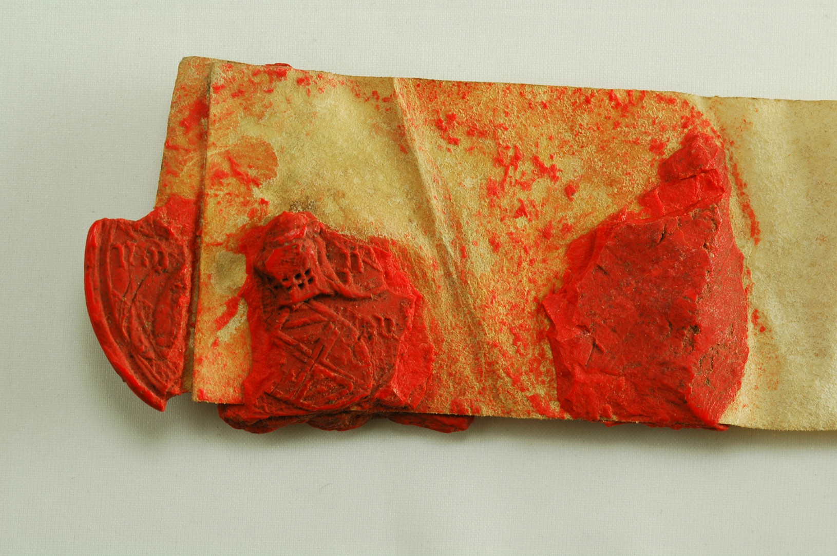 Impronta frammentaria. Si conserva parte di un cavaliere al galoppo verso destra, con lo scudo nella sinistra; il cavallo coperto da una cotta di maglia cui sono applicati dei panni. Questi ultimi e lo scudo sono inquartati, al 1° e al 4° di Borgogna moderna, al 2° e al 3° di Borgogna antica (sui panni i punti sono invertiti per "cortesia")]. Nel campo, sopra la coda del cavallo si distingue una lettera P